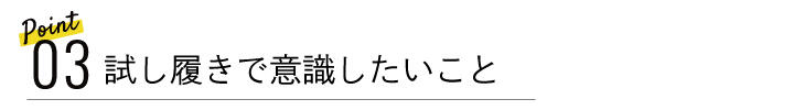 自分に合ったブーツを見つけるためには試着が鉄則です。 【ブーツのときに履く靴下で試す】 ブーツを履く際に使用する予定の厚手の靴下やタイツを必ず履いて試着しましょう。試着時と実際の着用時の厚みが違うと、フィット感が違ってしまう恐れがあります。 【両足で歩く】 足のサイズや形は左右で異なるため、必ず両足に履いて、店内で歩いてみてください。特に違和感がないかを確認することが重要です。