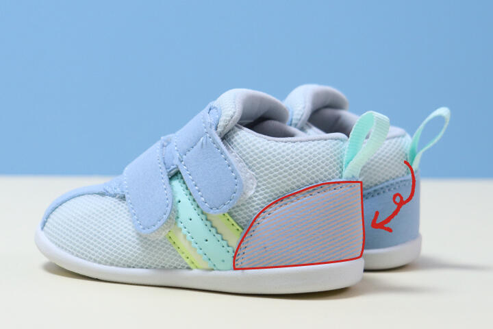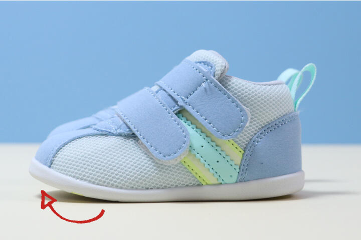 赤ちゃんの足首はぐらつきやすく、不安定です。 靴のかかと部分(ヒールカウンター)にしっかりとした芯が入っていて、ぐらつかずに足をまっすぐ支えてくれるものを選びましょう。 かかとを固定することで、足首がまっすぐ安定し、スムーズな一歩を助けてくれます。
