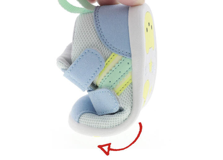 靴の底(ソール)が足の指の付け根に合わせて、 しなやかに曲がるか確認しましょう。靴が曲がりにくいタイプだと、歩行の妨げとなり、すり足のような歩き方に繋がる可能性があります。赤ちゃんの足本来の動きを邪魔していないかチェックしましょう。