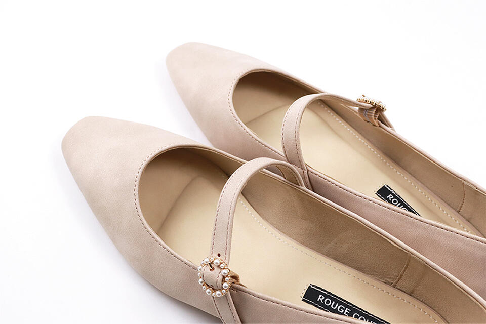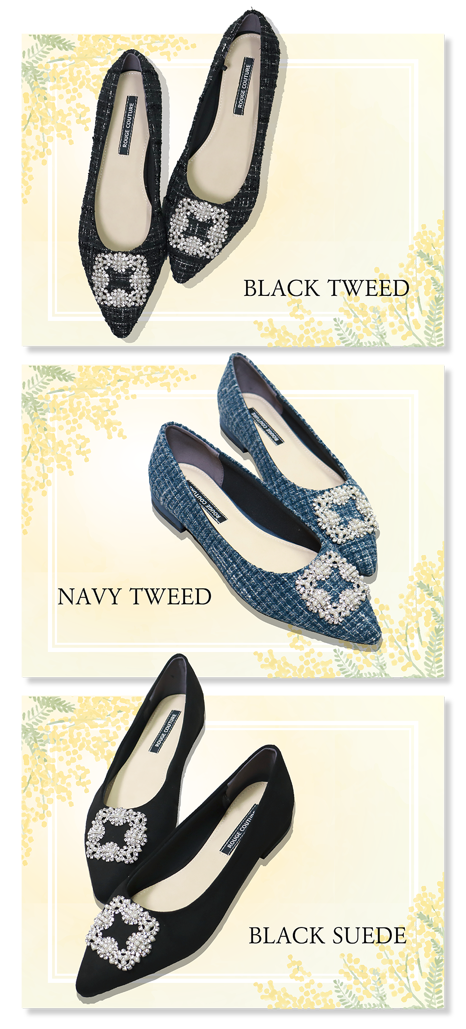 ツイード素材を使用し、贅沢な大ぶりパール&ビジューのバックルがローヒールでもエレガントかつ華やかに魅せてくれる。インソールはクッション性があり、抗菌防臭でいつも快適。