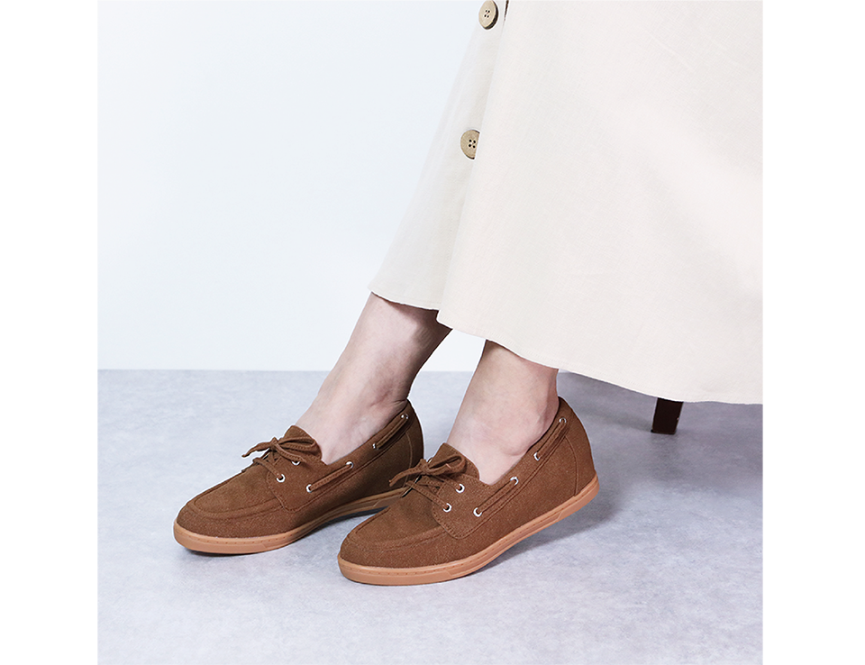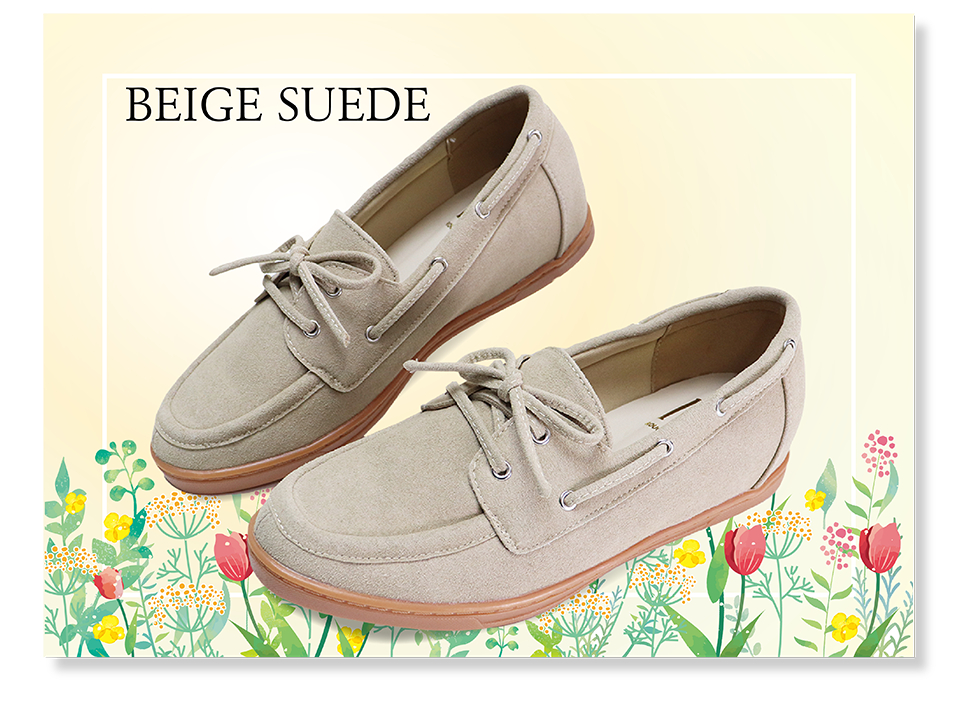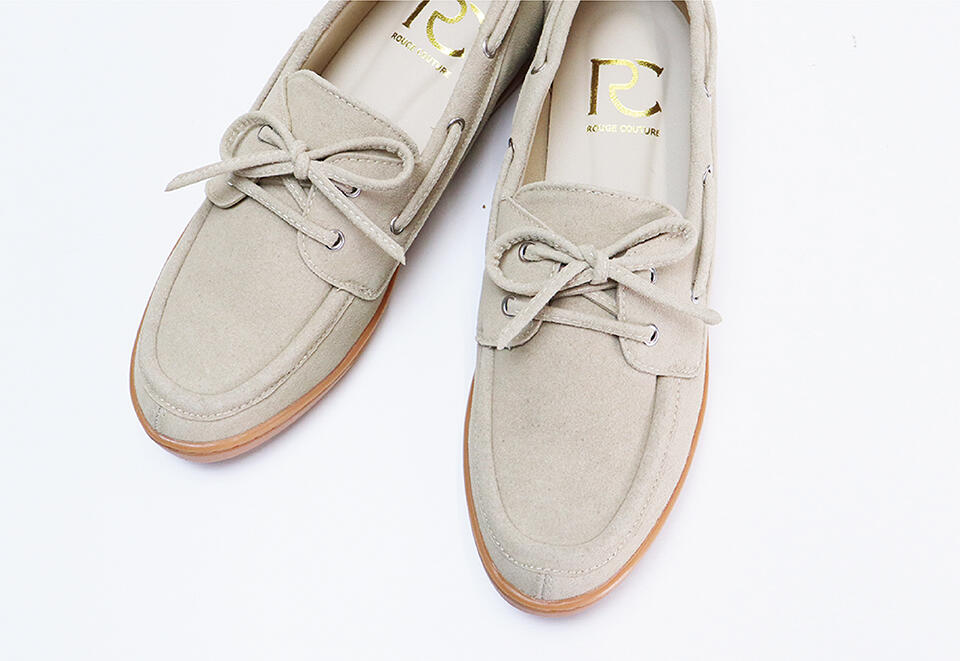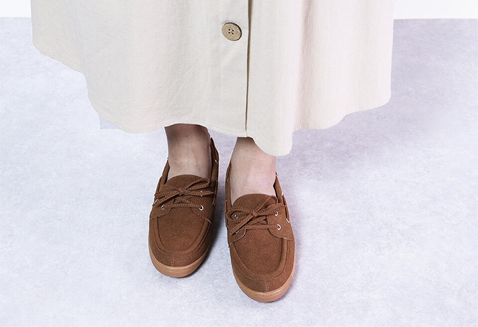 スエード調素を使用したモカシンです。フロントのリボンがデザインのアクセントになる、大人のカジュアルシューズです。スニーカー感覚で軽やかに歩ける1足です。