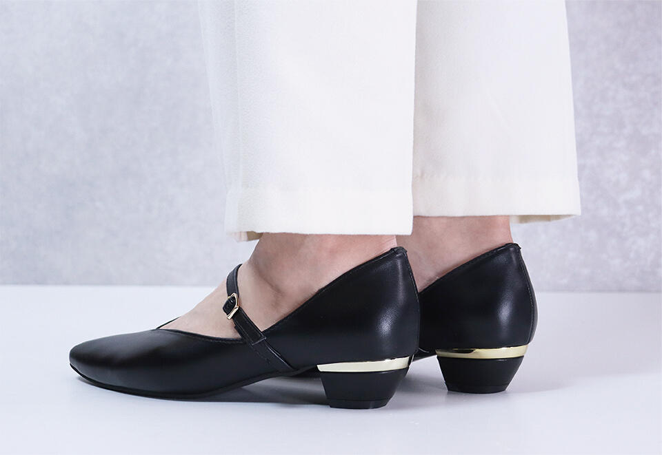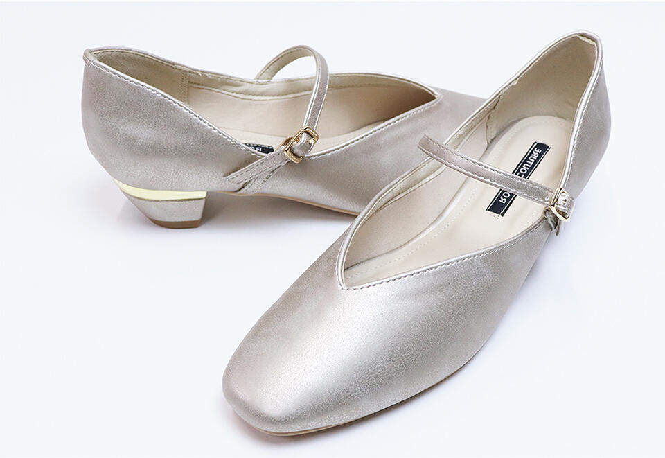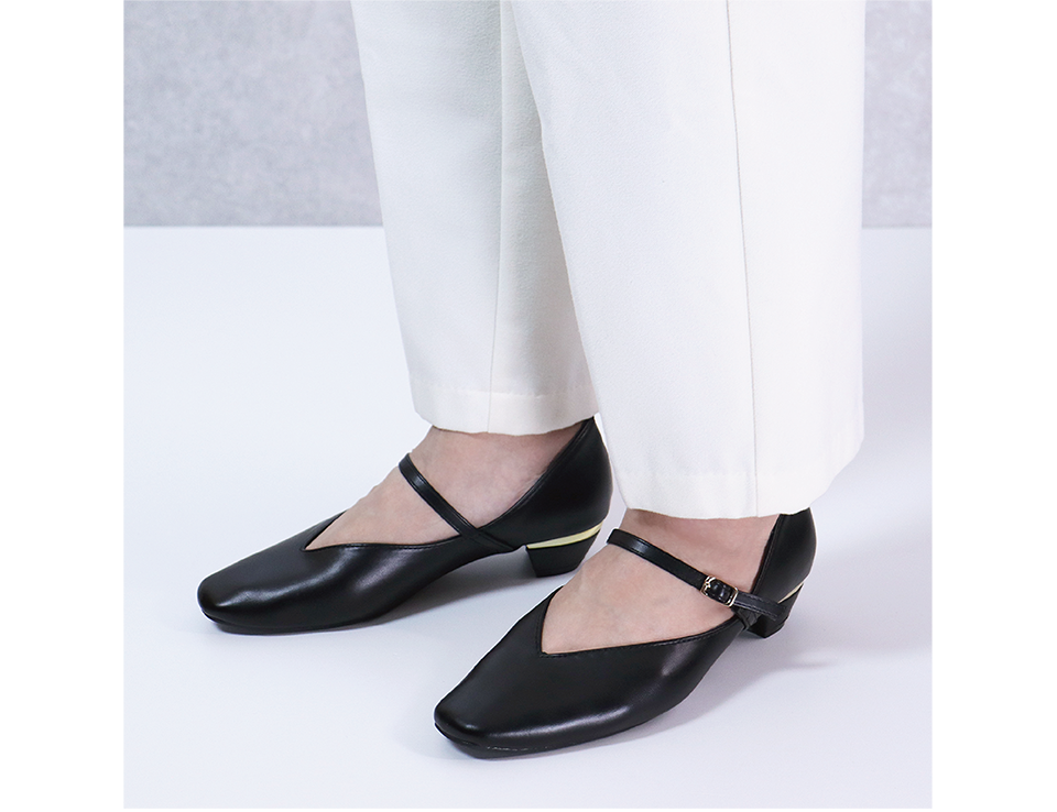 フロントのVカットデザインが華奢でエレガントさを演出。どの角度からも美脚見えのシンプルで上品なデザインは大人の女性にぴったり。かかとのゴールドラインがアクセントを。