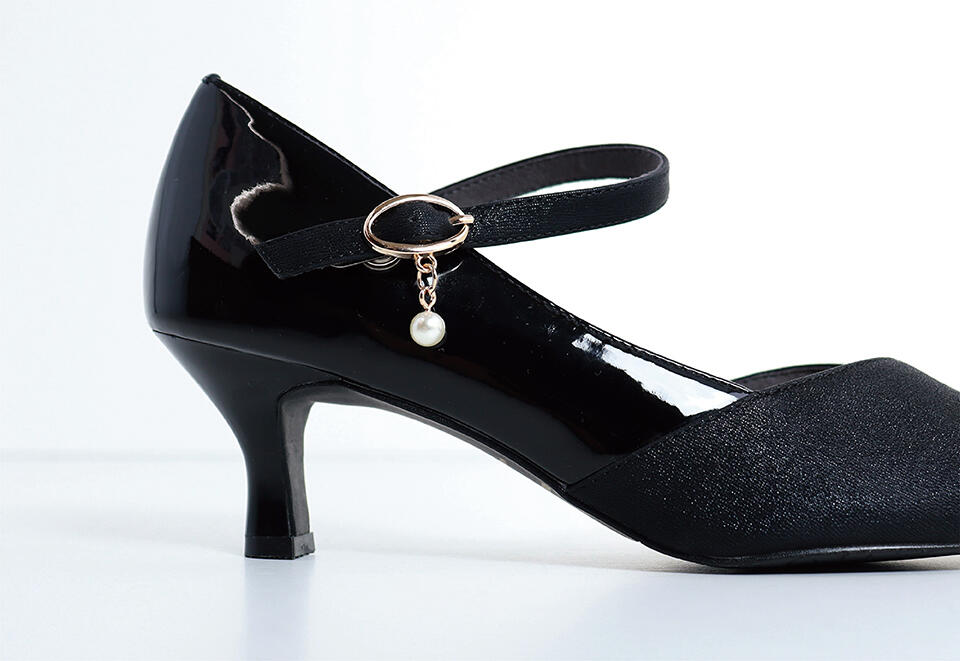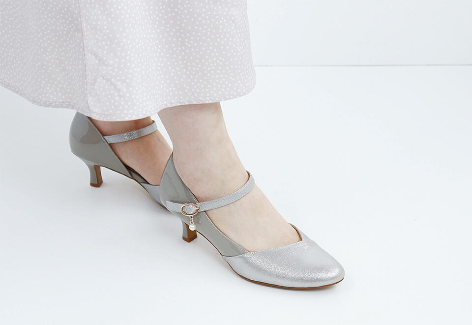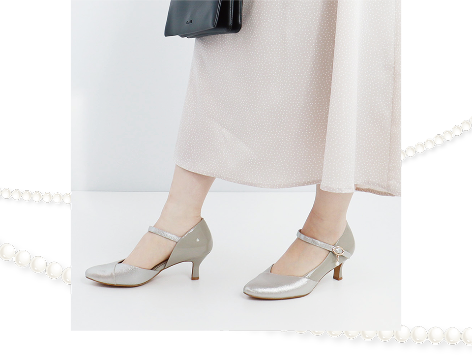 煌めくパールとラメ素材の輝きがエレガントな、セパレートパンプス。セレモニースタイルやきれいめコーデにおすすめの一足です。