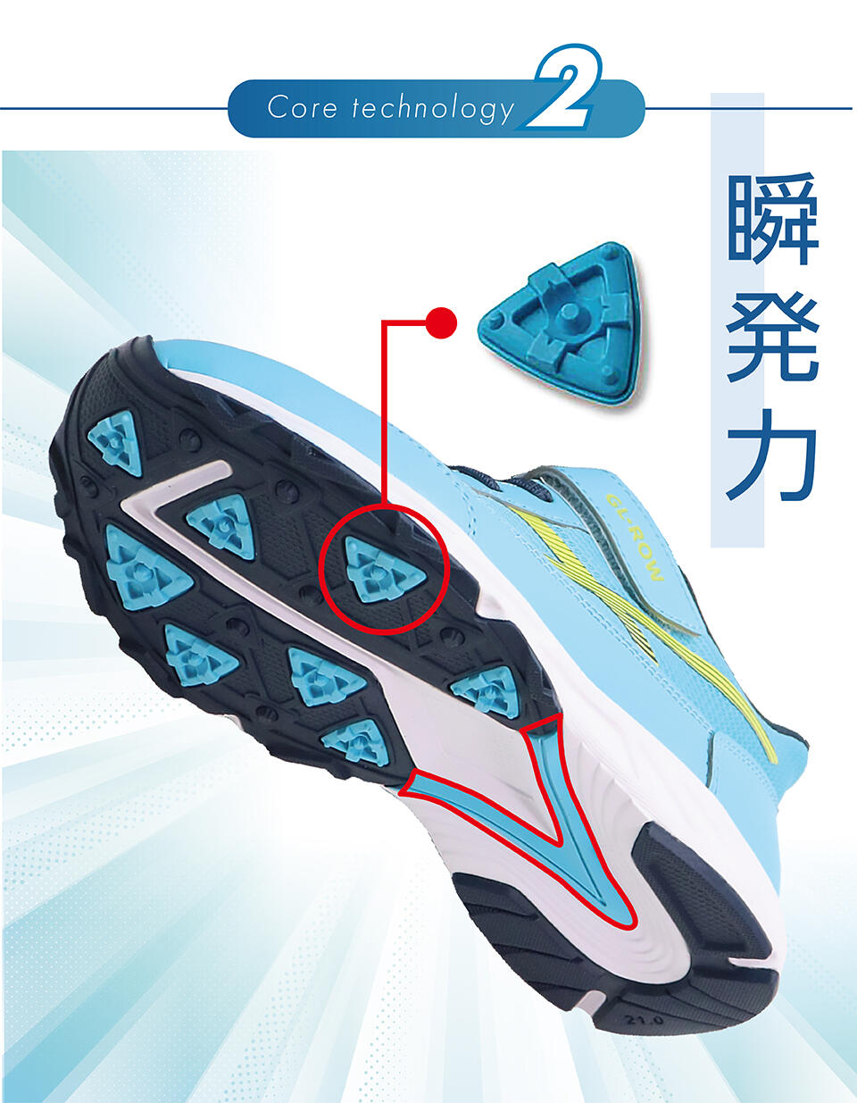 独自の三角形スタッドがあらゆる方向への蹴り出しを強力にサポート。着地時のブレを軽減。