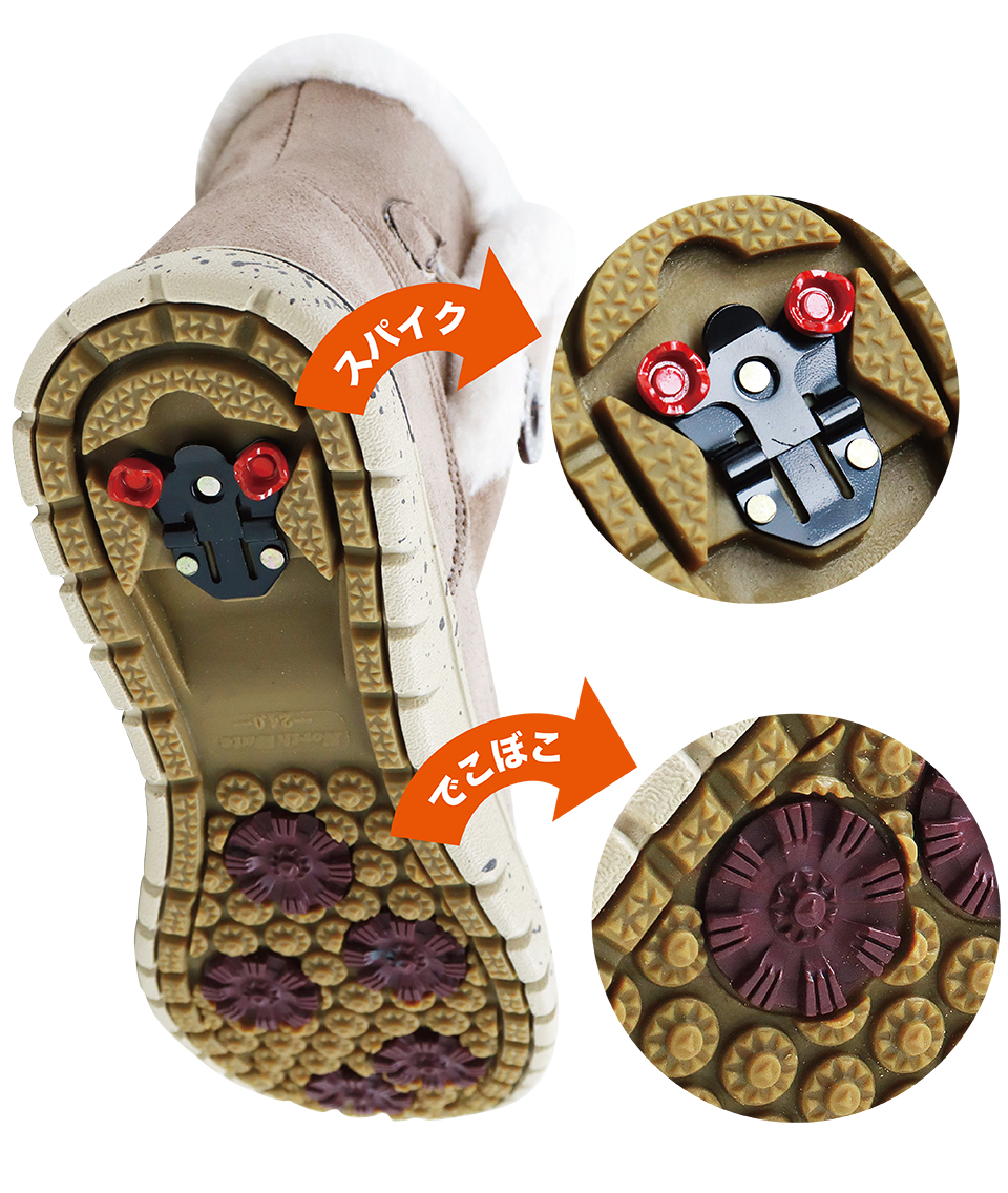 スパイク以外にも、靴底全体に細かい凹凸がついているので雪の様々な路面も安心して歩けます。