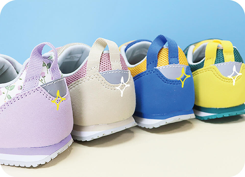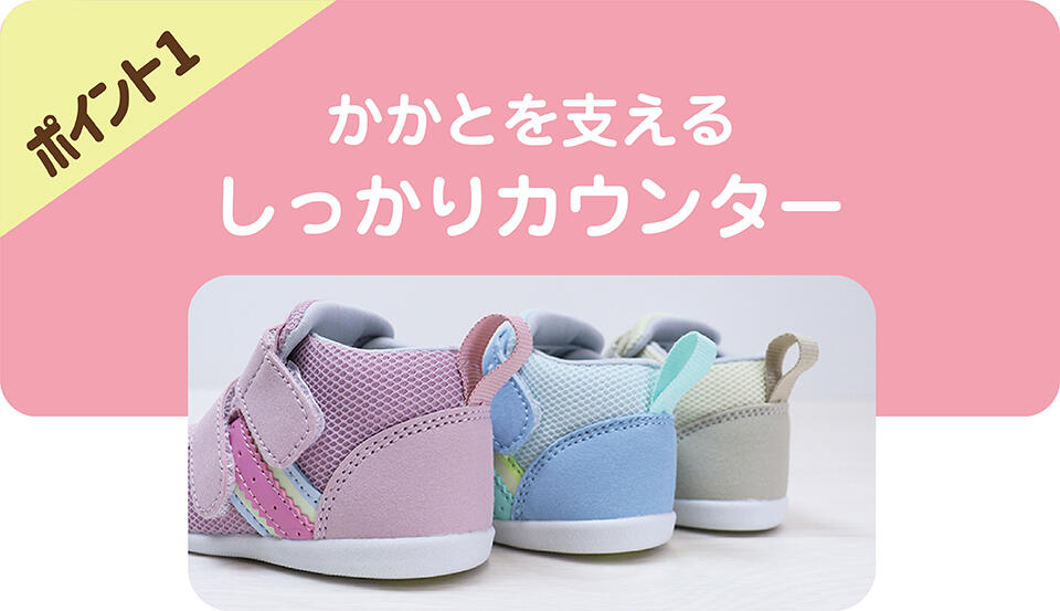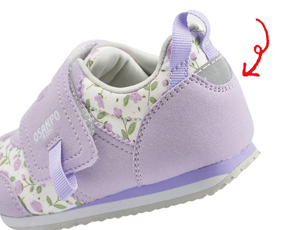 芯のあるしっかりカウンターを採用し、内側に倒れ込みやすい赤ちゃんのかかとをしっかり固定し、歩行を安定させます。