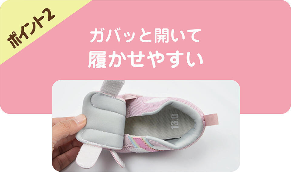 フィット感の調節がしやすい2本ベルトがガバッと開いて履かせやすい設計。お出かけの準備もサッとできます♪