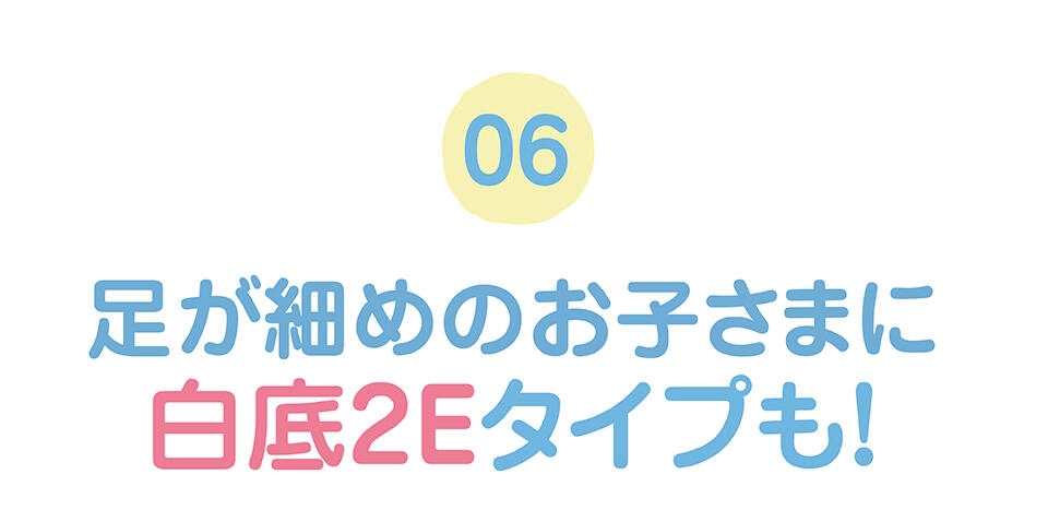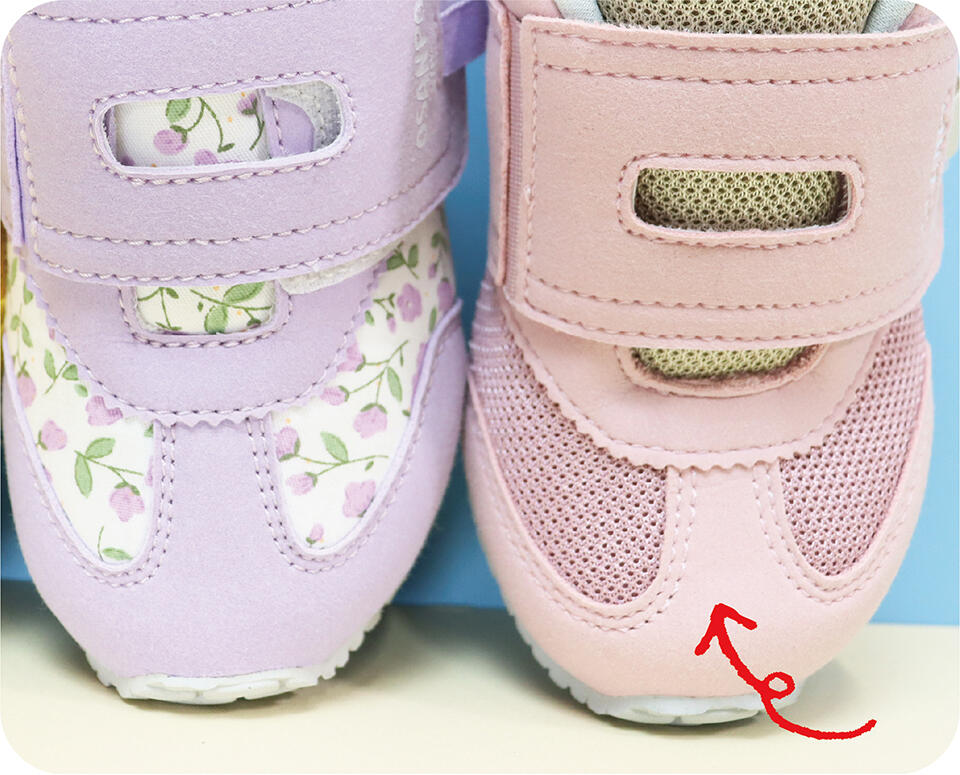 指先が広々快適な幅広設計。お子さんのつま先はまっすぐにのびていますか?つま先部分を指で押してパカパカしたり、すぐにつま先が当たったら見直そう!