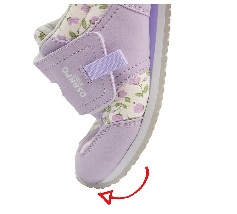 発育途中の縦横アーチをやさしくサポート。正しい位置で曲がり、かかとはしっかり固定して足のブレを抑えます。
