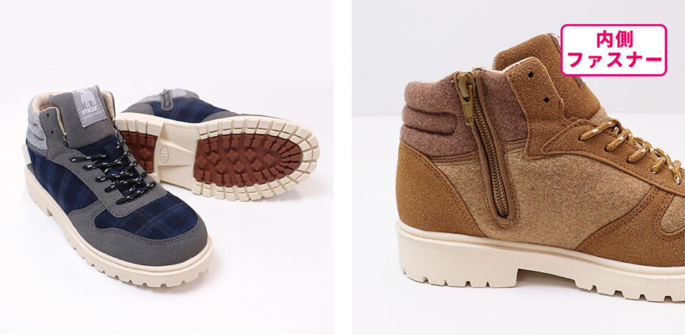 アッパー素材は暖かみのあるスエード調素材を使用。内側ファスナーを採用しハイカットスニーカーの履きにくさを解消。底裏は雨や雪の日の濡れた路面も滑りにくい防滑デザイン。