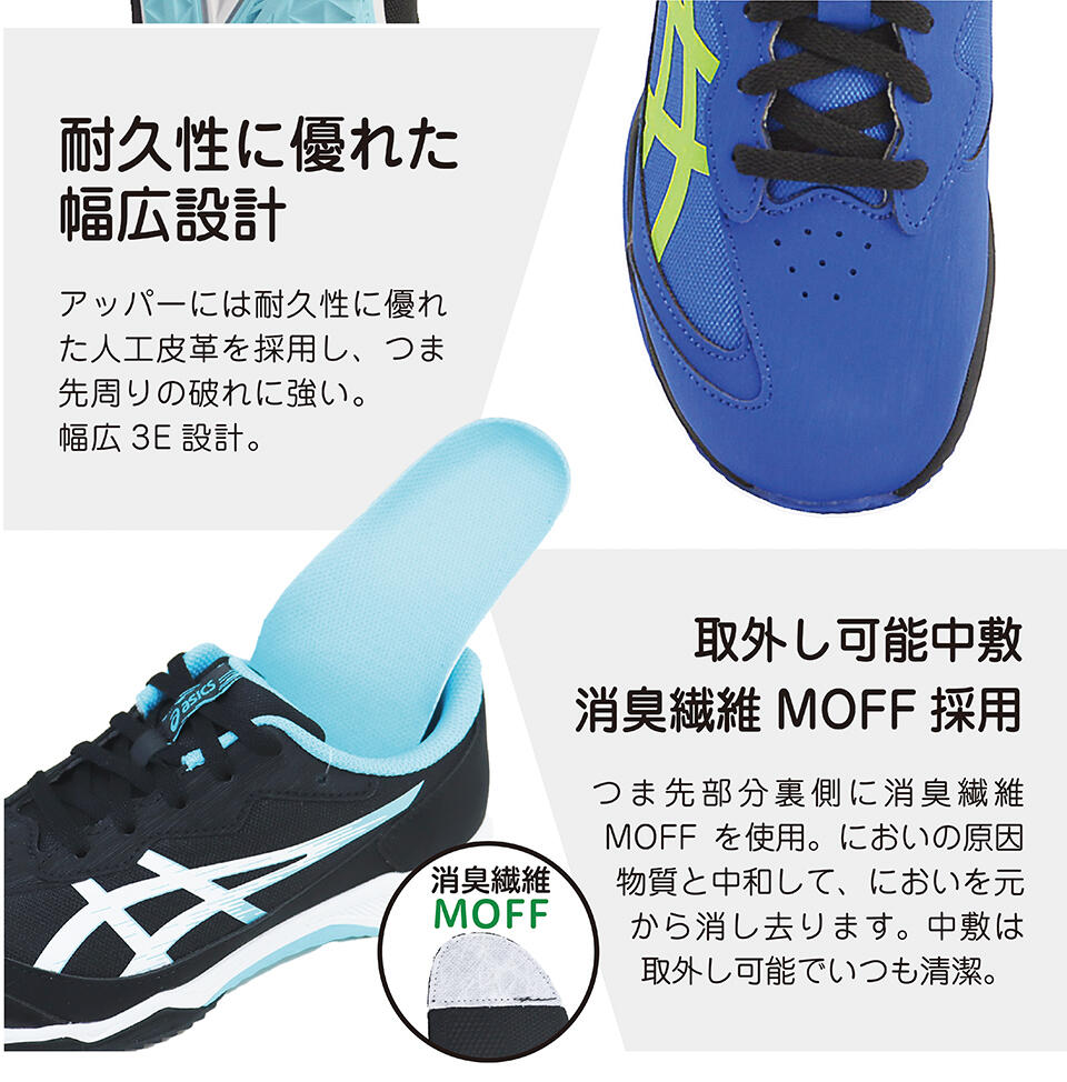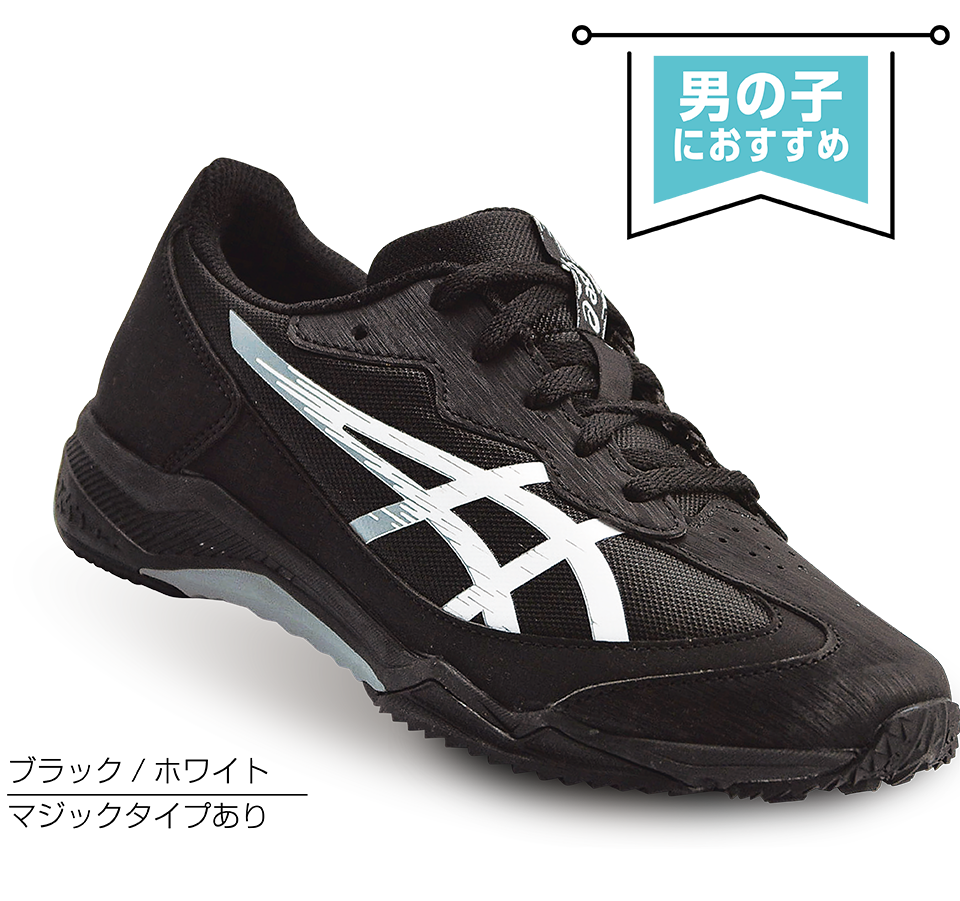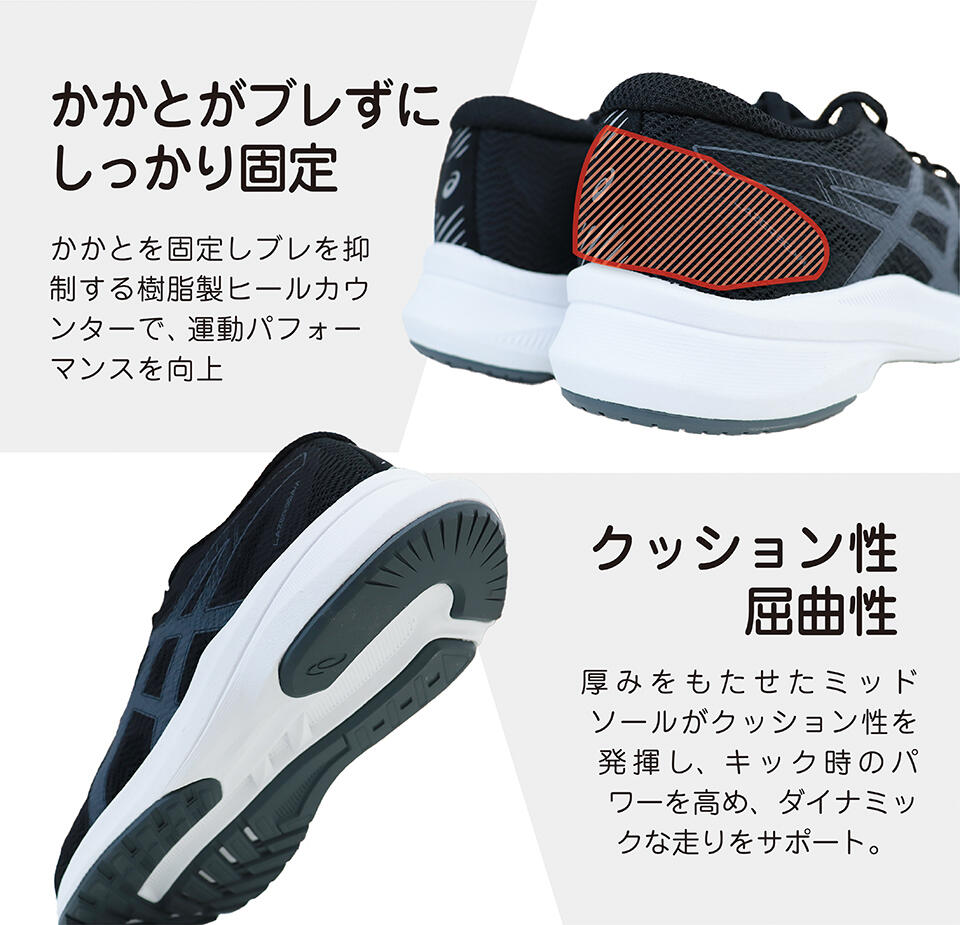 成長段階にあるお子様のかかとをしっかり固定し支える樹脂製ヒールカウンターを搭載。シャベル状のスパイクが路面をグリップしキック時のパワーを高め、ダイナミックな走りをサポート。
