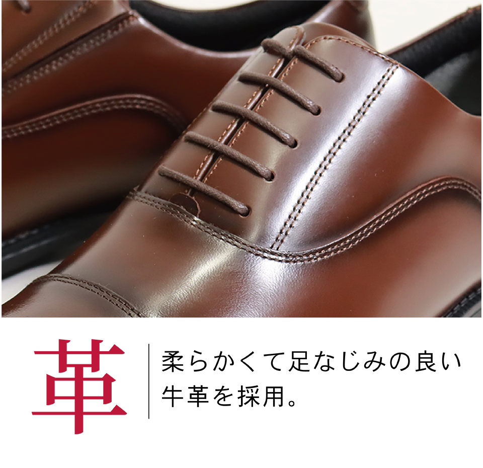 指まわりに余裕のある幅広4E相当設計を採用。柔らかい天然牛革が足に優しく馴染みます。ゆったり履けて、機能性も抜群の大人のためのビジネスシューズ。