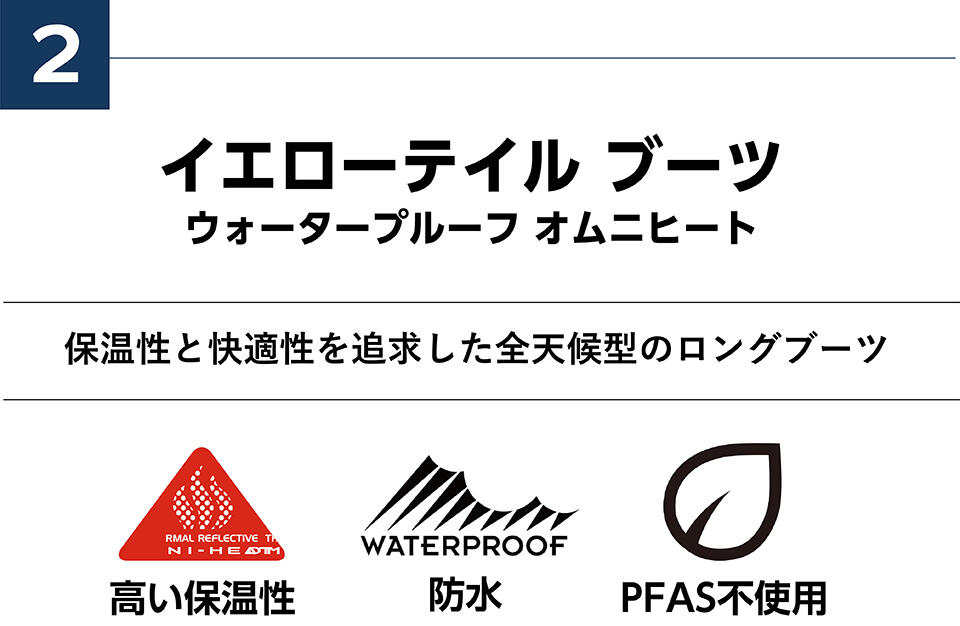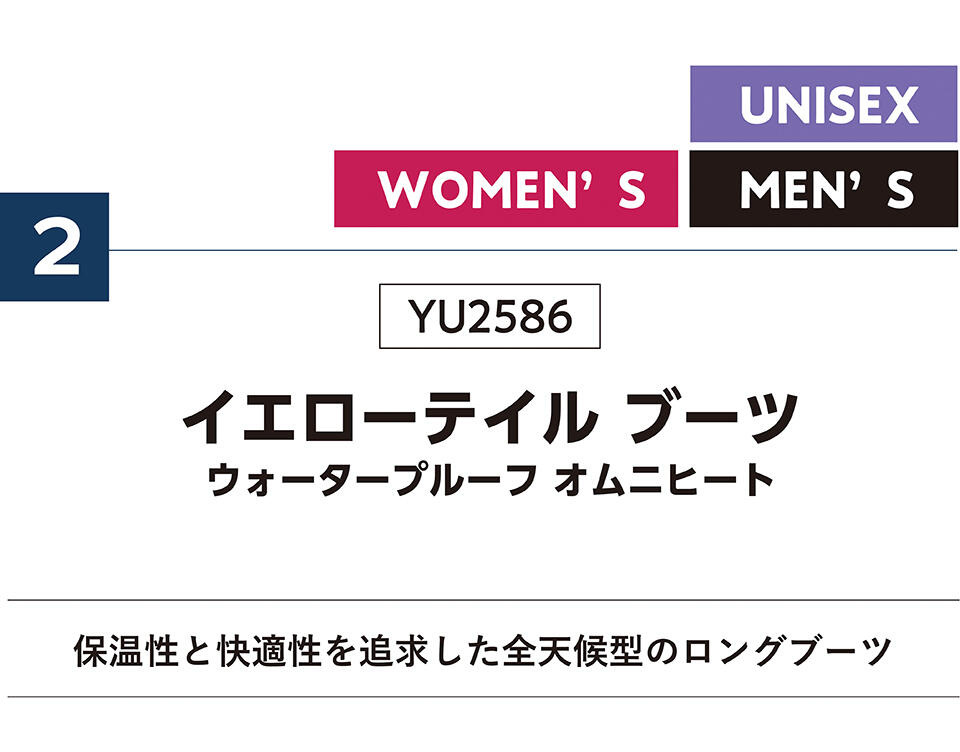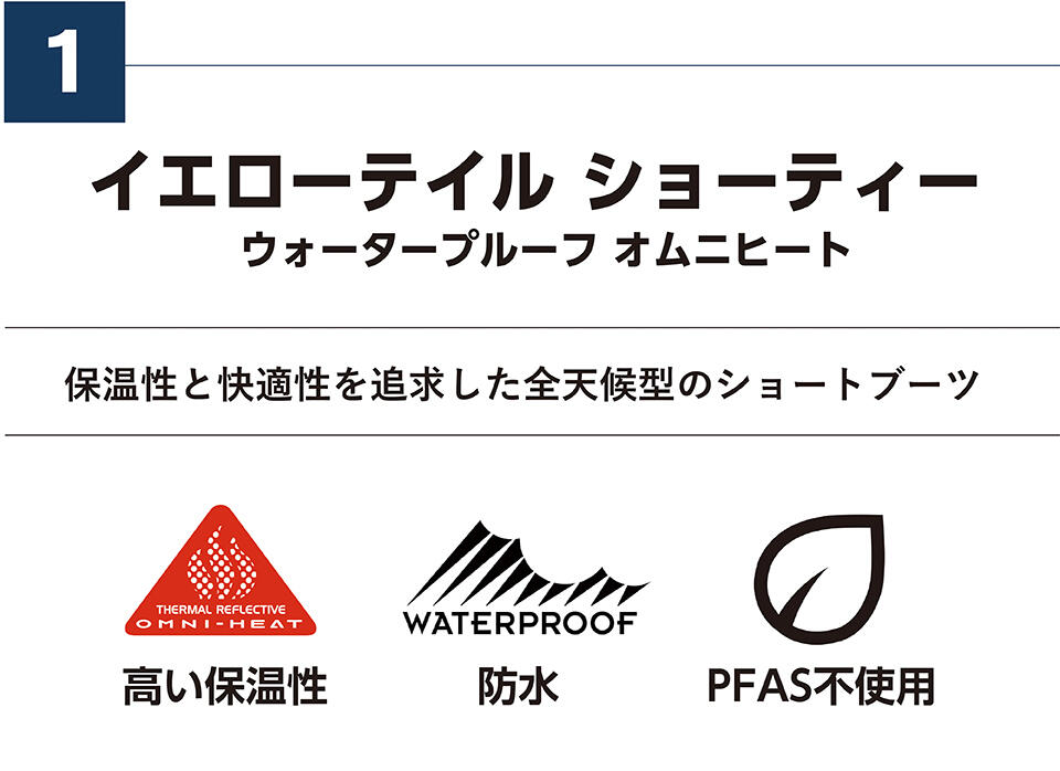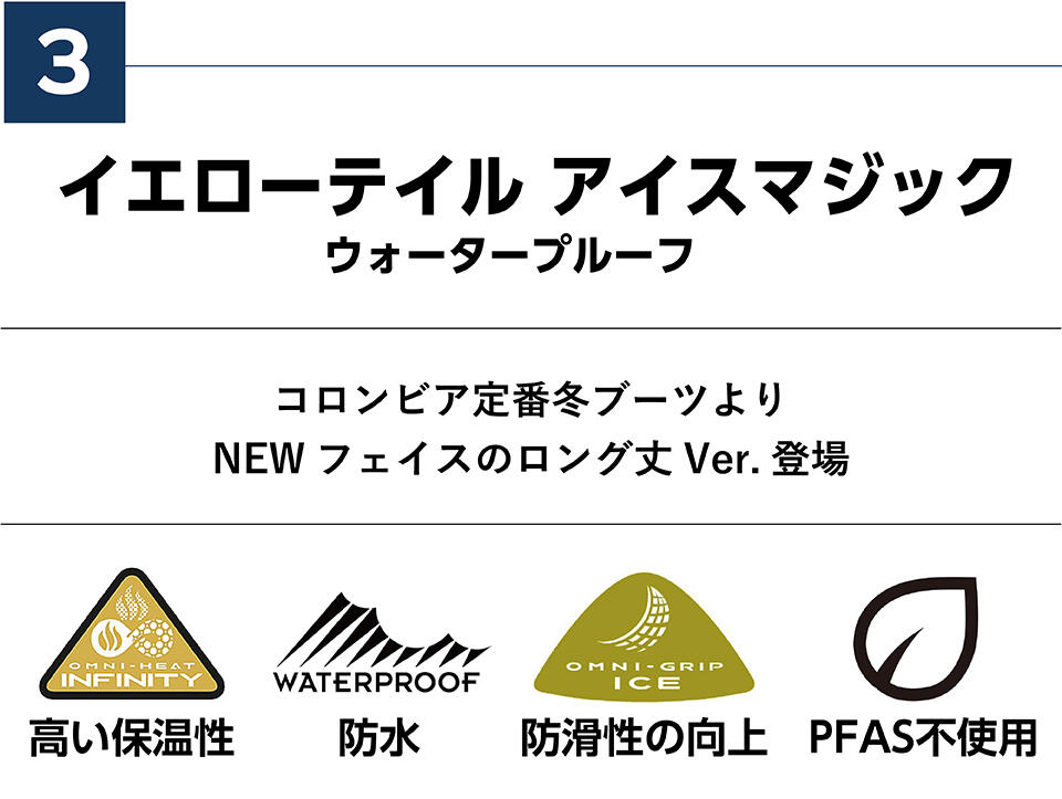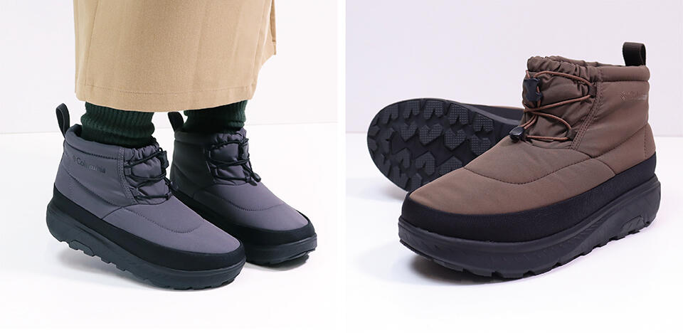 コロンビアのウィンターブーツは、ライナーに独自の熱反射保温機能を採用し暖かさをキープする「イエローテイル」や濡れた氷上でも滑りにくいソールにこだわった「サップランド」などの人気シリーズをラインナップ。冬の厳しい環境に対応するための独自の高機能テクノロジーが冬の足もとを支えます。
