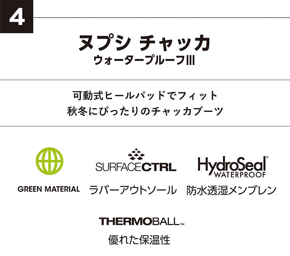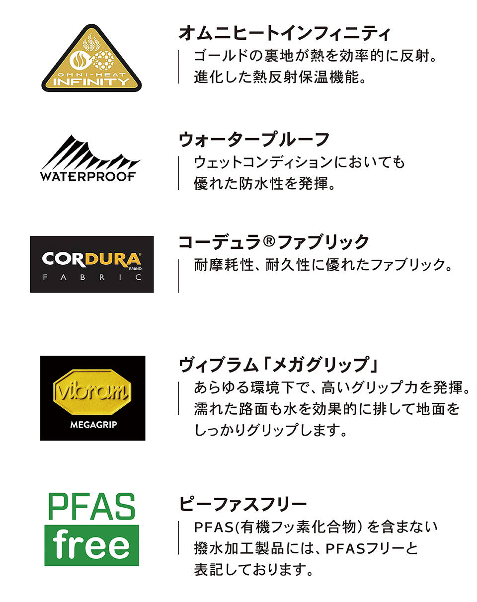 防水透湿メンブレンによって、冬のブーツに最も求められる快適性を両立させており、これにより、雪や雨の中でも足が濡れる心配がなく快適に過ごせます。