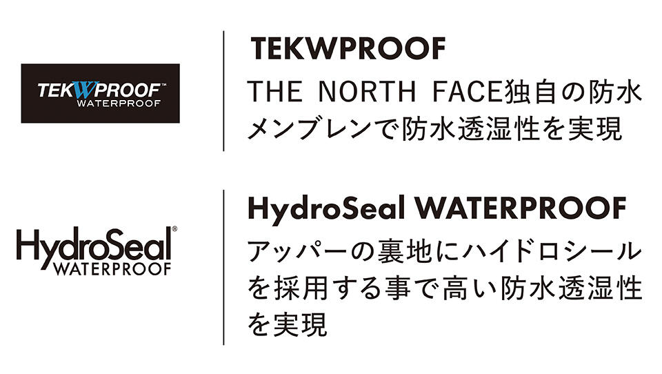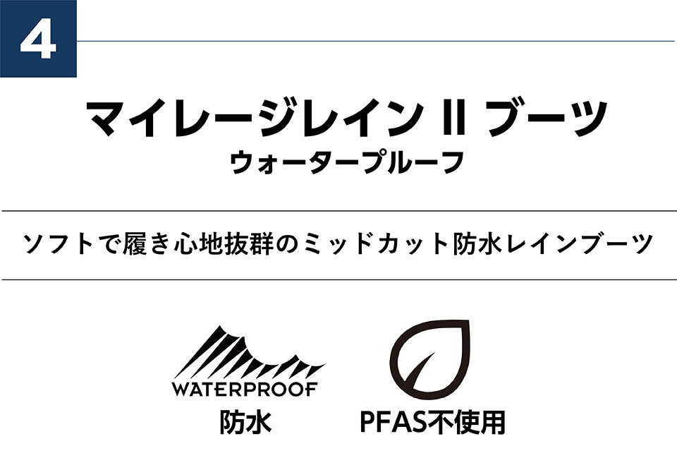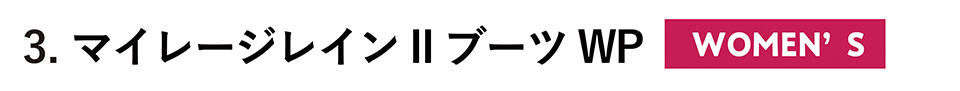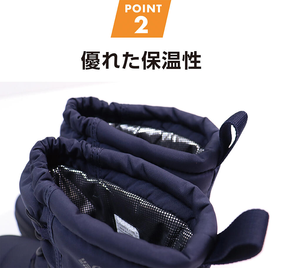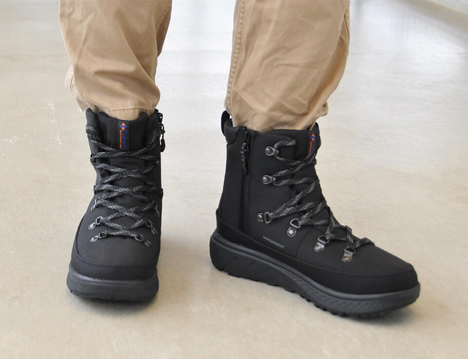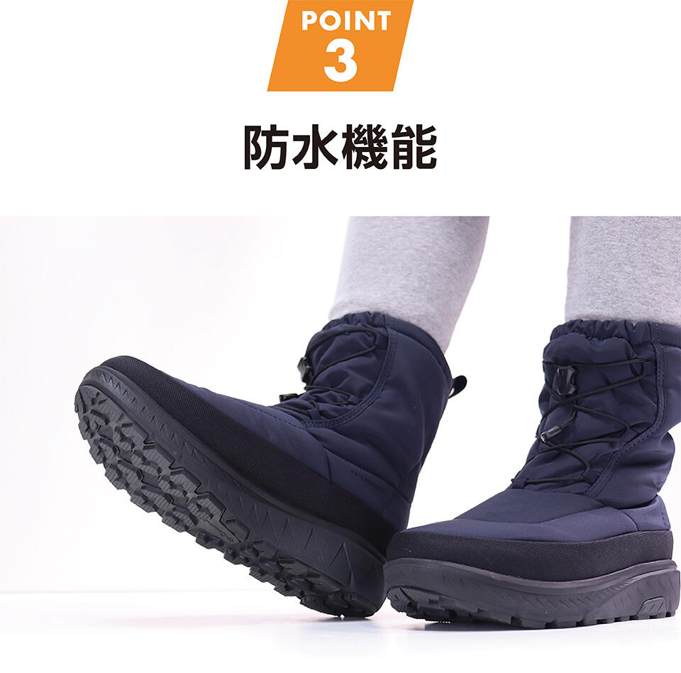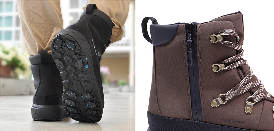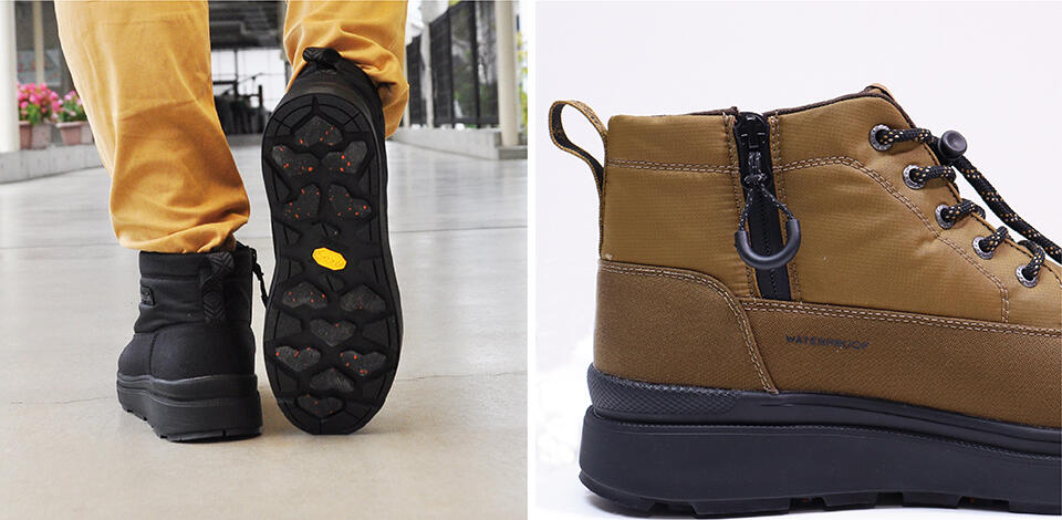 ウォータープルーフ仕様のファブリックが使用されており、雨や雪の侵入を防ぎ、足元を快適でドライに保ちます。
