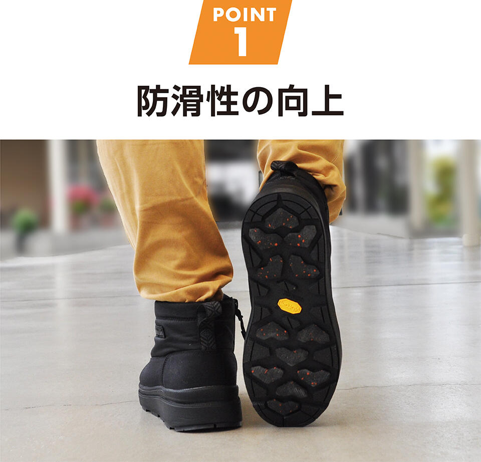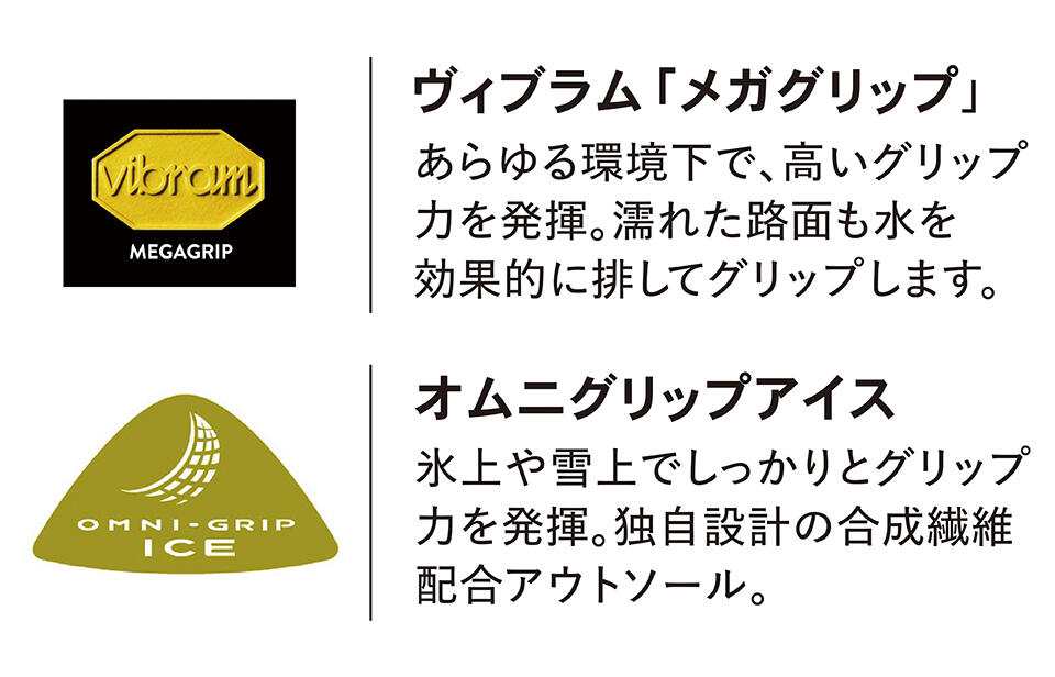 底面を従来のモデルよりも広く(ワイドに)設計することで、歩行時の安定性を大幅に向上。アドバンスモデルではVibram MEGAGRIPを採用。