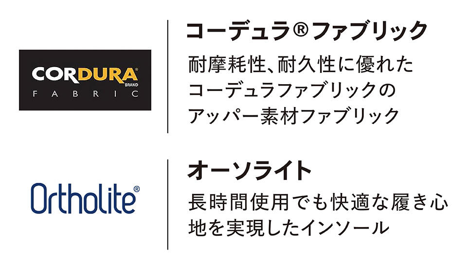 コーデュラファブリックが外側の耐久性を確保し、また、オーソライトインソールで内側のクッション性を提供。タフさと履き心地を両立しています。