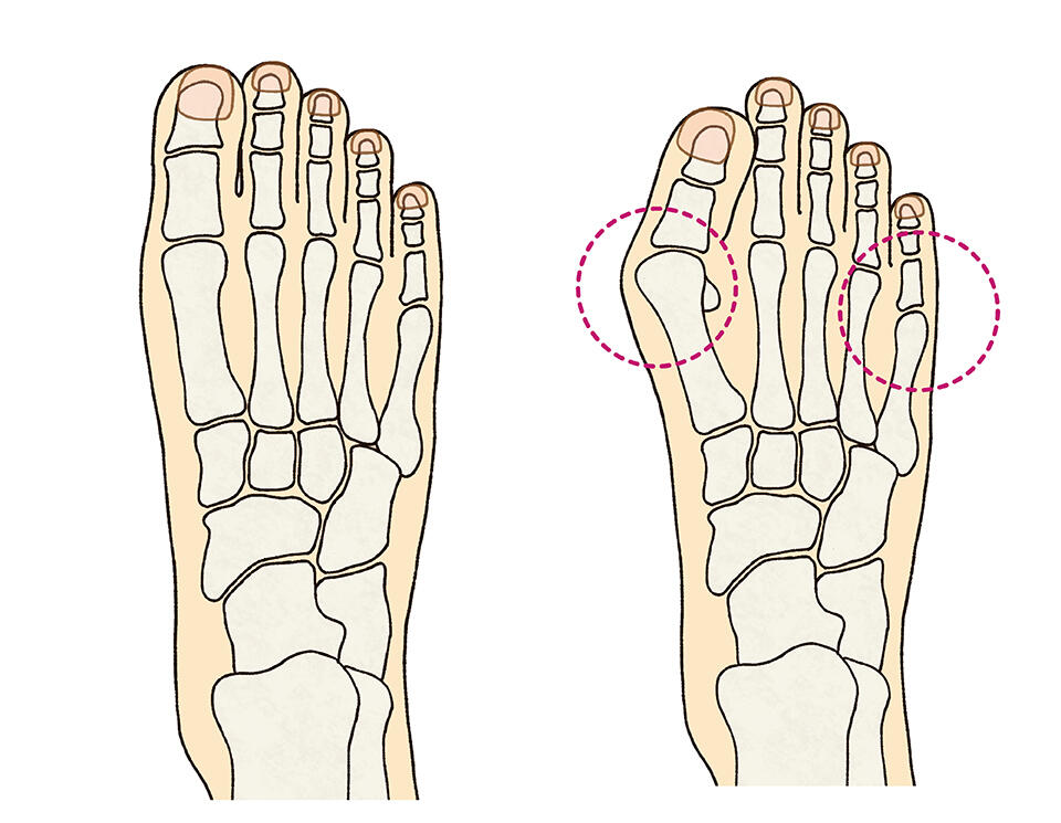 この状態になると、出っ張った親指の付け根が靴に当たって痛みを感じやすくなります。悪化すると、靴を履いていない時でも痛みを感じるようになることもあります。