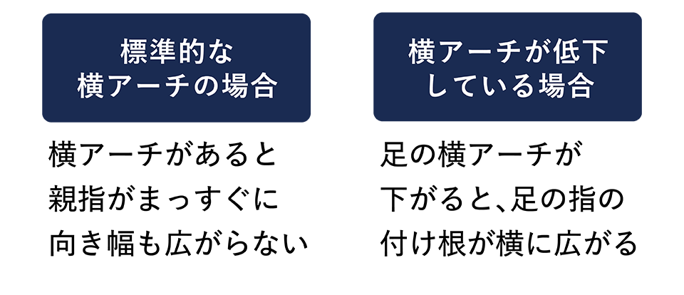 足の指の付け根あたりを横に走るアーチ。足指の機能をサポートし、バランス感覚を保ちます。