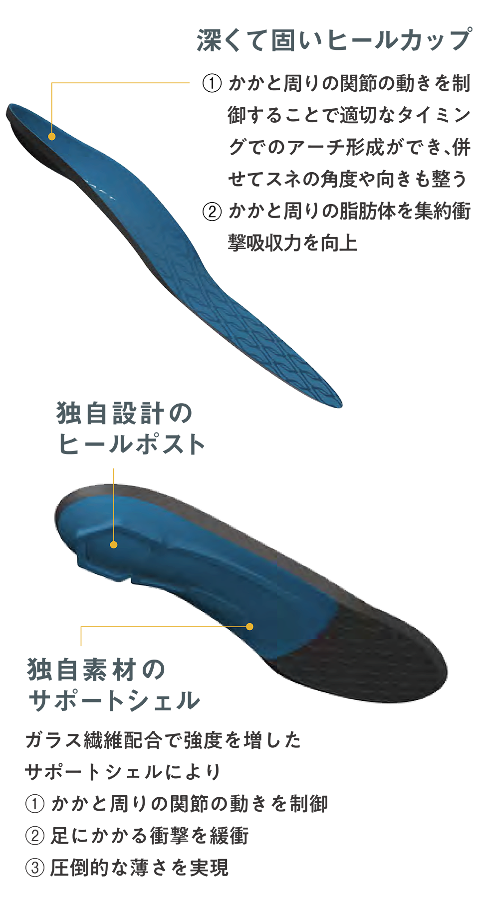 安定感のある少し幅広のシェルを搭載した、サポート力の高いインソール。高いサポート力と安定感を求める方、特に足への衝撃が大きい活動をされる方におすすめ。