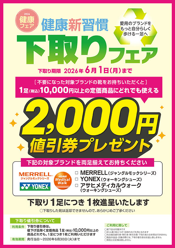 ただいま当店では、不要になった対象ブランドのシューズをお持ちいただくと、1足(税込)10,000円以上の定価商品にどれでも使える、2,000円値引券プレゼントいたします。